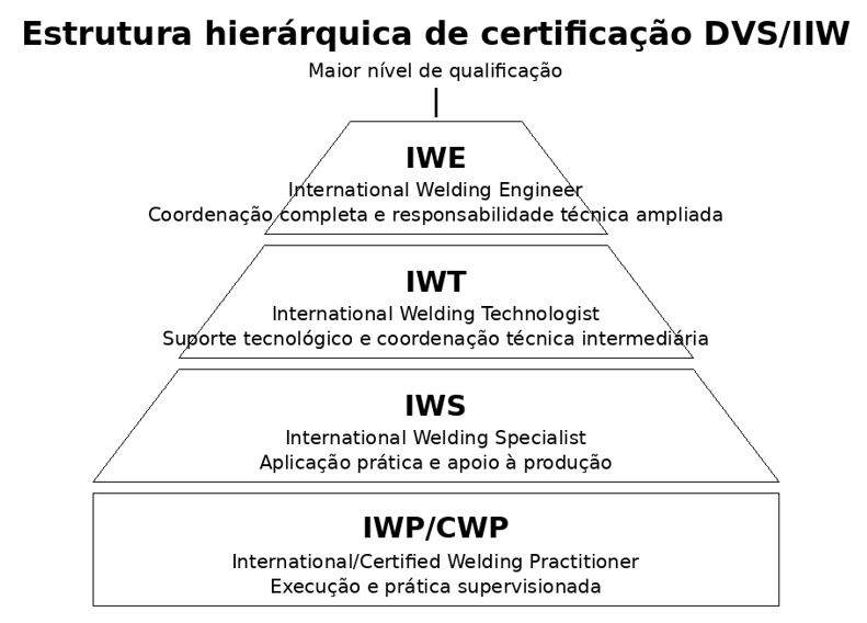 O sistema de qualificação profissional em soldagem estabelecido pelo IIW, em conjunto com a DVS – Deutscher Verband fur Schweissen, organiza a certificação do pessoal de coordenação de soldagem em níveis hierárquicos. Essa estrutura permite o enquadramento das competências técnicas conforme a complexidade das atividades a serem desempenhadas e evidencia o posicionamento do IWE como nível mais elevado de qualificação.