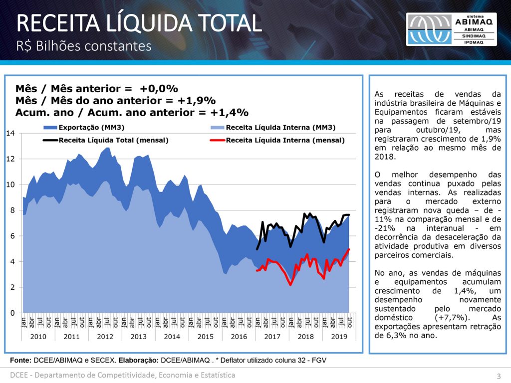 Receita líquida − As receitas de vendas da indústria brasileira de máquinas e equipamentos ficaram estáveis na passagem de setembro para outubro de 2019, mas registraram um crescimento de 1,9% em relação ao mesmo mês de 2018.Essa melhoria do desempenho das vendas continuou sendo puxado pelas vendas internas. Já as vendas realizadas ao mercado externo registraram novas quedas, de 11% na comparação mensal e de 21% na interanual, em decorrência da desaceleração da atividade produtiva em diversos parceiros comerciais. No acumulado do ano, as vendas de máquinas e equipamentos acumulam um crescimento de 1,4%, desempenho este novamente sustentado pelo mercado doméstico, que evoluiu 7,7%.